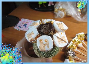Futbolarientzako gozokietatik futbola baloi bat egingo dugu. Beharrezko materialak: gozokiak (zuriak eta beltzak), egurrezko toothpicks, guraizeak, hot-melt gun, lore belaki, lore-sareak.